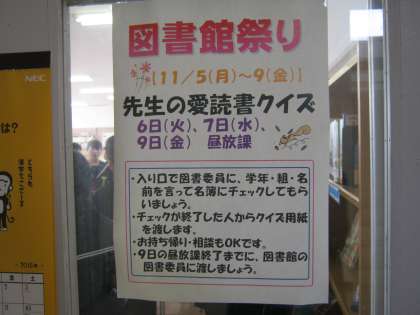 11/6(火) 図書館祭り 公開日 2018/11/06 更新日 2018/11/06 学校の様子 図書館祭りが開催中です。今日から昼放課に先生の愛読書クイズが始まりました。たくさんの生徒が来館し、大盛況でした。本に親しむ読書の秋となっています。 いいね(0)