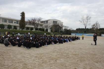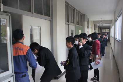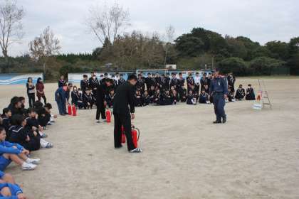 調理室から出火したという想定で、火災避難訓練が行われました。全校生徒が整然とすみやかに避難できたのがさすがです。訓練後は、2・3年生は水消火器の体験、1年生は煙体験を行いました。災害は忘れたころにやってきます。防災意識を高める訓練になりました。