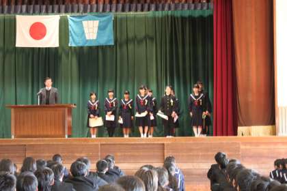 3学期が始まりました。子どもたちの元気な顔とにぎやかな声が学校に帰ってきました。始業式の後、表彰伝達もありました。創意工夫,全知多卓球大会、尾教研書写コンクール、剣道の昇段などの表彰でした。いろいろな分野で頑張っている南陵中生がいます。
