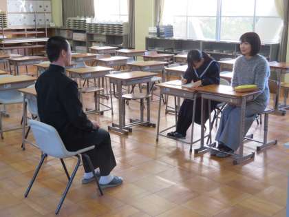 1/9(水) 3年生面接練習 公開日 2019/01/09 更新日 2019/01/09 3年生 3年生では、受験に向けて面接練習を始めています。繰り返し練習して、堂々と受け答えしたり、自分の考えを表現したりできる力を高めていきましょう。特に「志望の動機」は必ずと言っていいほど尋ねられますので、明解に答えられるようにしておきましょう。 いいね(0)
