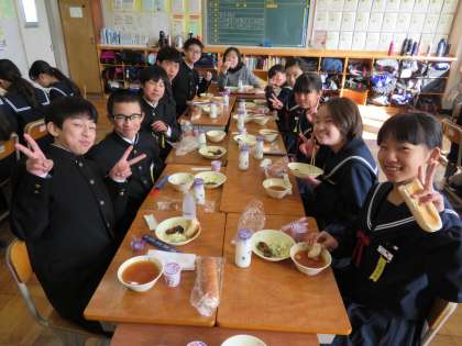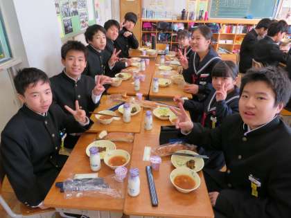 1/29(火) 1年生 給食訪問3 公開日 2019/01/29 更新日 2019/01/29 1年生 学校給食週間のため、1年生の給食に校長が訪問しました。本日の献立は、「愛知の米粉パン、ミネストローネ、鶏肉のハーブ焼き、コーンサラダ、卓上マヨネーズ、ヨーグルト、牛乳」でした。1年生の子どもたちは、和気あいあいと会食を楽しんでいました。男女がとても仲良く、アットホームな雰囲気のクラスでした。 いいね(0)