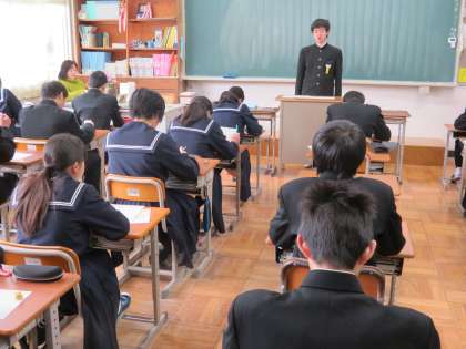 本日も2年生の国語の授業では、スピーチ発表の活動が行われました。原稿を見て発表するのではなく、メモだけを見て、スピーチをする活動に挑戦しています。「風力発電を増やした方がよい」「先輩や先生方への言葉遣い」「テストでいい点を取るための勉強法」「ルールやマナーの意識について」「ポイ捨てを減らし、環境状態を改善したい」など、身近な生活、学校生活や社会の様子から考えたことを発表していました。発表後に感想を聞いてみると難しかったという声もありましたが、みんな大変頑張っていました。