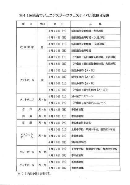 2/25(月) 第41回東海市ジュニアスポーツフェスティバルの競技日程 公開日 2019/02/25 更新日 2019/02/25 お知らせ 「第41回東海市ジュニアスポーツフェスティバル」の競技日程をお知らせします。少し先ですが、ご予定をお願いします。どの部活動も熱心に練習に取り組んでいます。応援よろしくお願いします。 いいね(0)