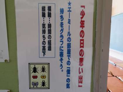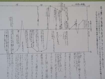 1年生の国語の授業では、「少年の日の思い出」という作品を学習しています。主人公の行動と気持ちの変化との関連性を読み取り、グラフにまとめたレポートが学年掲示板に掲示されています。読み取りと、それをどう表現するかで工夫された学習が行われています。