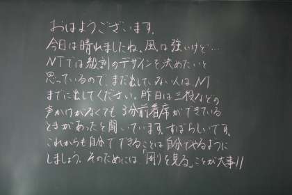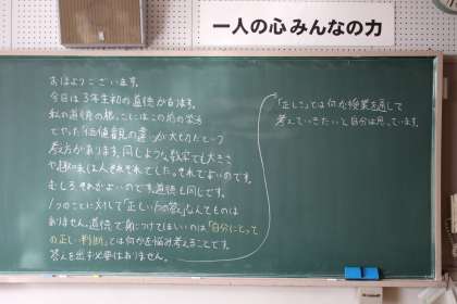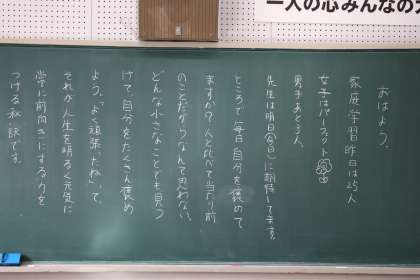 黒板日記 公開日 2019/04/11 更新日 2019/04/11 学校の様子 朝、クラスに入ると、黒板に担任からのメッセージがありました。どんなクラスにしていきたいか、どんな生徒に育ってほしいか、担任の思いが伝わってきます。これからどんなクラスになっていくのか楽しみです。 いいね(0)
