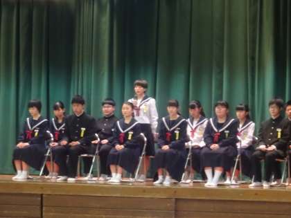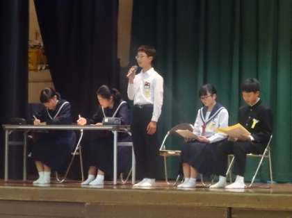 全校生徒の参加による生徒総会が開催されました。委員会の活動計画を発表する場面では、どの委員長もしっかりと前を向き、堂々と伝えることができました。執行部の役員数を変更する生徒会会則の改定案も承認され、無事議事を終了しました。