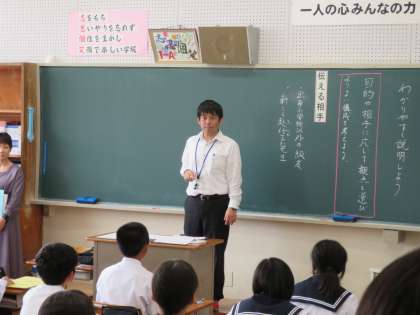 1年A組の授業は特設授業とし、全員で参観しました。そして、午後にはよりよい授業づくりに向けて研究協議を行いました。