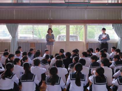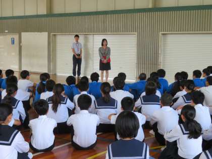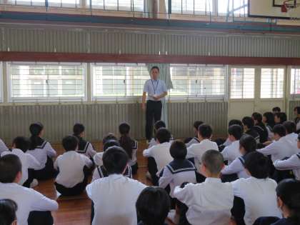 朝会後の風景です。学年ごとに集まり、先生たちの話を聞きます。学年のまとまり、先生たちと生徒のつながりを感じます。
