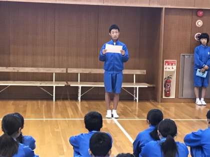 朝の集い 公開日 2019/06/24 更新日 2019/06/24 2年生 体育館で朝の集いを行いました。まだ眠そうな子もいましたが、頑張ってラジオ体操をしていました。朝のスピーチでは、昨日の反省を踏まえて行動しようという力強いメッセージが伝えられました。今日も一人一人がしっかりと責任を果たし、学年みんなで二日目のプログラムを楽しんでいきましょう。 いいね(0)