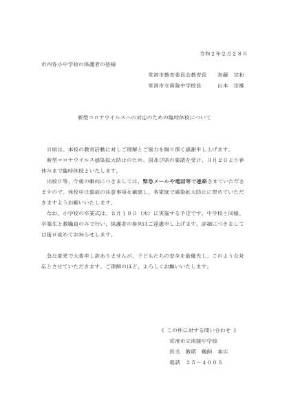 新型コロナウイルスの感染拡大を防止するため、3月2日(月)から春休みまで臨時休校とします。次の登校日は、保護者メールで連絡させていただきます。