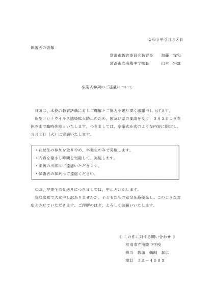 卒業式は、3年生と職員のみで時間を短縮して実施します。見送りはありません。