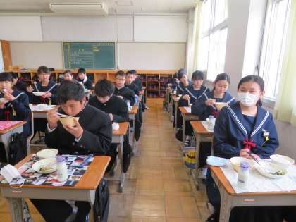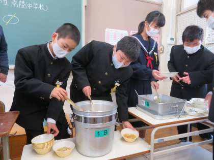 給食スタート 公開日 2021/04/09 更新日 2021/04/09 1年生 今日から給食が始まりました。1年生にとっては、南陵中での配膳も食事も初めてです。てきぱきと動く姿に感心しました。しばらくはまだ前向きでの会食です。 いいね(0)