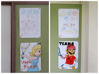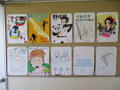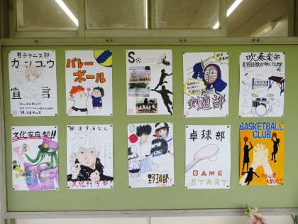 1年生の掲示板に部活動のポスターが貼られています。新入部員募集のポスターです。部活動見学は14日(水)から始まります。自分が楽しみ、がんばれる部活動はどれか、じっくり考えてみてください。