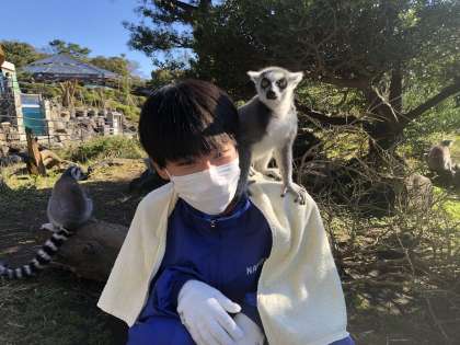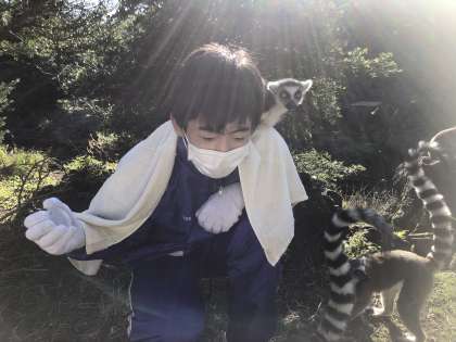 動物飼育体験では、動物たちとふれあいました。ワオキツネザルが肩に乗ってきて、とてもうれしそうでした。