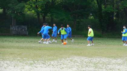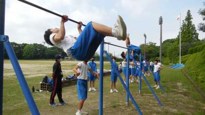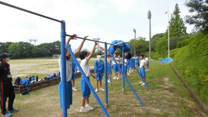 男子の体育の授業では、前半、後半に分けて、鉄棒とサッカーの2種目に取り組んでいました。1時間の授業時間の中で、体を動かす時間をしっかりと確保するための工夫です。こうしたところにも教師の技が見られます。