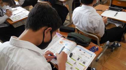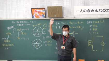 技術の授業です。電気回路図について学習しています。定規を用いて、回路図を書いています。