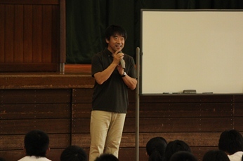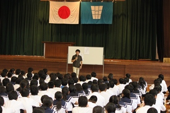 7月7日(木)。岐阜大学の近藤真庸先生を講師として迎え講演会を開きました。テーマは「生き方と性〜恋にはルールがある」。保健委員が行った異性や人生設計に関するアンケート結果を寸劇で発表しました。そのあと、近藤先生の講演が始まりました。先生ご自身の体験を踏まえながら、「恋をすることのよさや大切さ」を話していただきました。最後に、自作の歌を熱唱され、生徒たちに心温まるメッセージを贈っていただきました。
