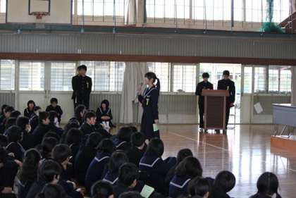 2月23日(木)。後期生徒総会を行いました。この1年間の各委員会の活動報告、各学級のJRC活動報告が承認されました。そのあとの意見発表では、3年生から多くの意見が出されました。「表に出て活躍できる人もいれば、裏方で人を支えることが得意な人などいろいろな人がいます。自分のもっている力を発揮することが大切だと思います。」「今年初めて行った南陵祭では生徒会スローガン『一人の心 みんなの力』のようにがんばろうとする人をみんなで協力して盛り上げていたことに感動しました。来年もさらによい南陵中をみなさんの手でつくりあげてください。」など1・2年生への励ましと期待の言葉があふれていました。来年度創立50周年を迎える南陵中に力を与える会となりました。