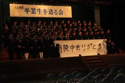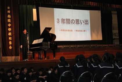 南陵中のみんなにありがとう〜卒業生を送る会〜 公開日 2012/03/01 更新日 2012/03/01 学校行事 2月29日(水)。卒業生を送る会を生徒会が企画・運営して行いました。1年生からは、卒業生に3年間の思い出を振り返ってもらうためのスライド上映を、2年生からは部活動ごとにお礼の言葉を卒業生に送り感謝の気持ちを伝えました。卒業生からは、お礼の手紙をお世話になった先生に渡しました。1年間一緒に過ごしたすべての人たちに感謝の気持ちを伝えあったとても温かい会になりました。 いいね(0)