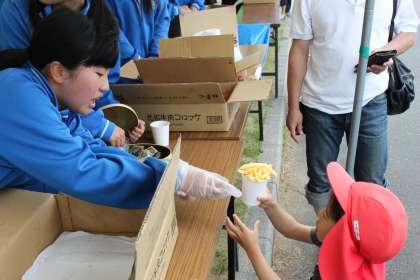 5月19日(日)、小脇公園20周年記念にボランティアとして3年生の女子12名が参加しました。コロッケやフライドポテトを揚げて販売したり、宣伝をしたりしました。また、重い荷物を運ぼうとしたお年寄りの方に代わって荷物を運ぶ心優しい場面も見られました。とても一生懸命活動しており、地域の方から感謝され、大変よい1日になりました。