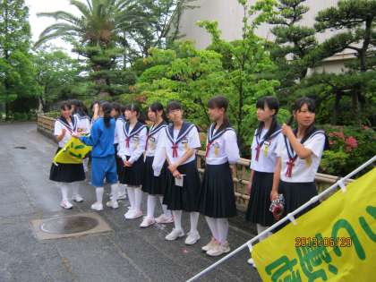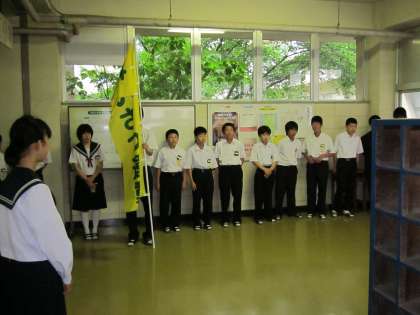 ボランティアで集まった生徒が、とても大きな声であいさつしていました。