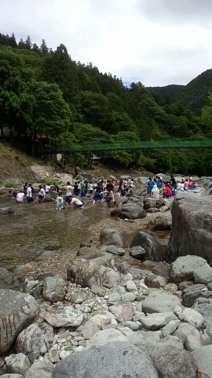 川遊びタイムです。水は冷たいですが、みんな楽しく遊んでいます。