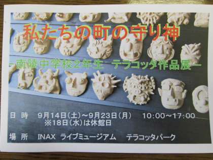 テラコッタ作品展 公開日 2013/09/12 更新日 2013/09/12 2年生 1学期に作成したテラコッタが完成し、テラコッタ作品展を開催します。 生徒の力作が数多く展示されています。ぜひ来館し、鑑賞してください。 日時 9月14日(土)〜23日(月) 10:00〜17:00 ※18日(水)は休館日です 場所 INAXライブミュージアム テラコッタパーク いいね(0)