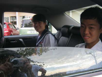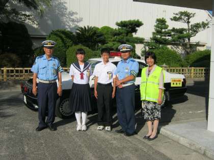 本日の早朝、秋の交通安全運動で生徒2名がパトカーに乗ってあいさつ運動をしました。