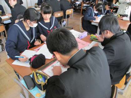 多くの先生が見守る中、生徒はいつも以上に緊張しつつ、自分の考えを分かりやすく伝えるために、ワークシートを記入したり、グループ内で話し合ったりするなど、真剣に授業を行っていました。