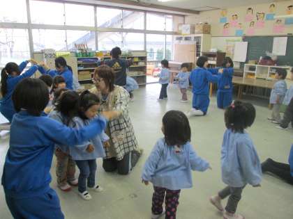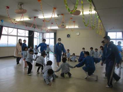 ハンカチ落とし、ねことねずみゲーム、椅子取りゲーム、お正月遊び、リズム遊びなど生徒は、園児と楽しくかかわっていました。