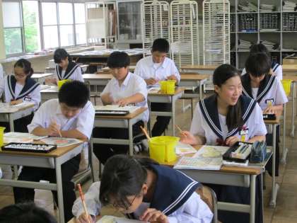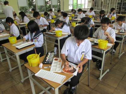 1年B組、美術の様子です。 「スプーンの中の自分」の絵を塗っています。