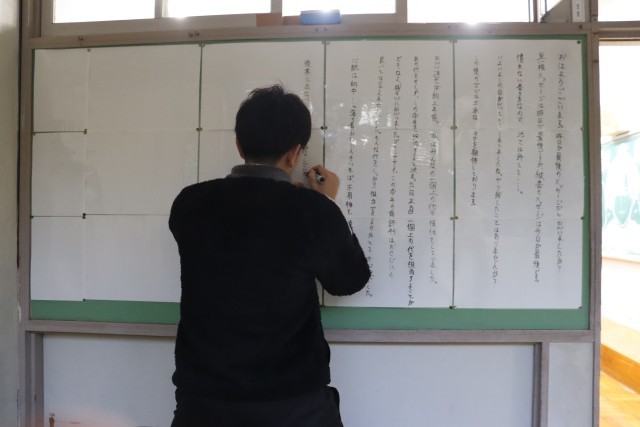 校長先生の式辞では、みんなが幸せになるためには、明るい笑顔と、当たり前のことを当たり前に行うことが大切であるという点についてお話がありました。式の後、小中学校作品展入選者と、尾張教育研究会書写作品コンクール入賞者の表彰を行いました。