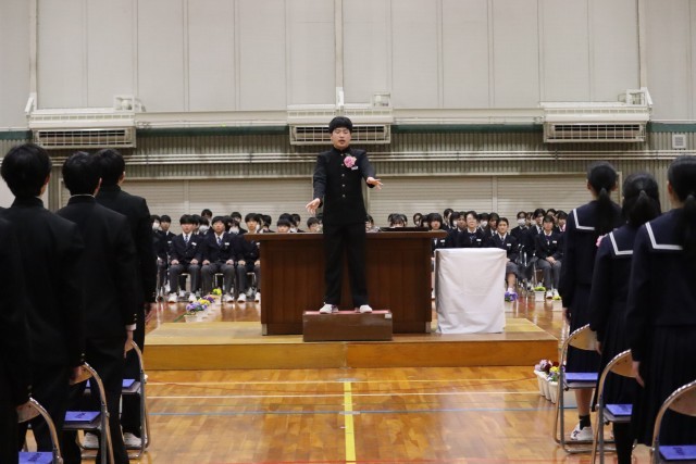 在校生代表による送辞。先輩たちとの思い出、先輩たちからもらったもの、その感謝を伝え、南陵中の良き伝統を引き継いでいく決意を伝えてくれました。