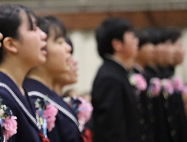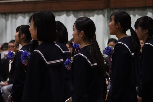 卒業生代表による答辞。3年間の思い出、先生やおうちの方への感謝、仲間への思いを心を込めて伝えてくれました。言葉の途中で想いが溢れ出て、涙しながら一生懸命に伝えている友の言葉を聞き、涙を浮かべているたくさんの仲間の様子がありました。素敵な言葉を届けてくれてありがとう。