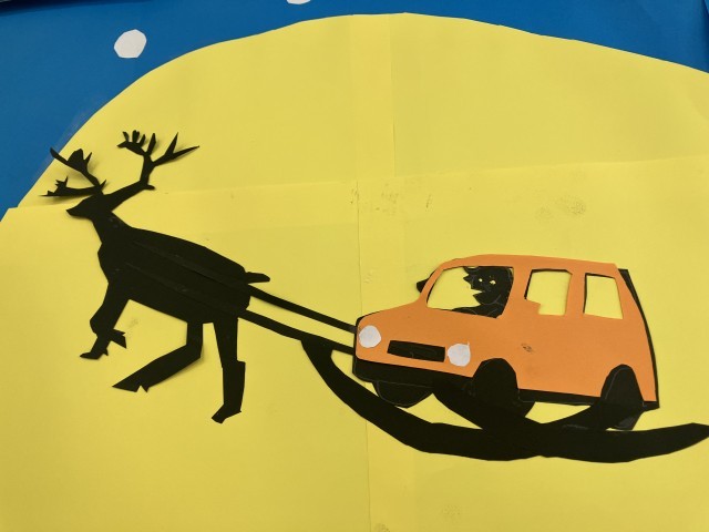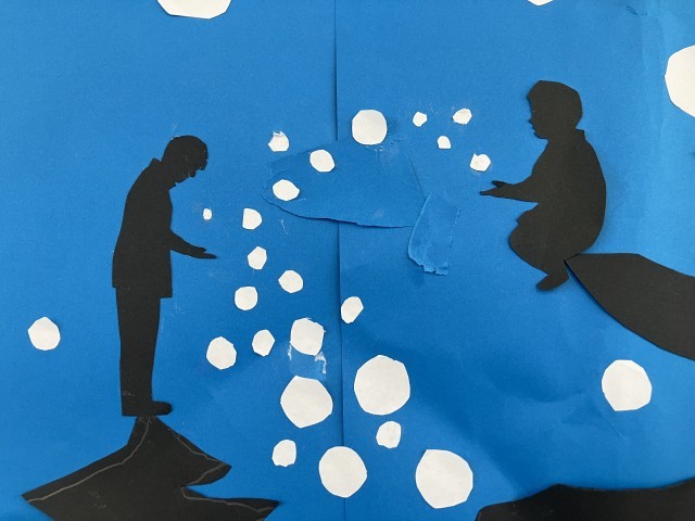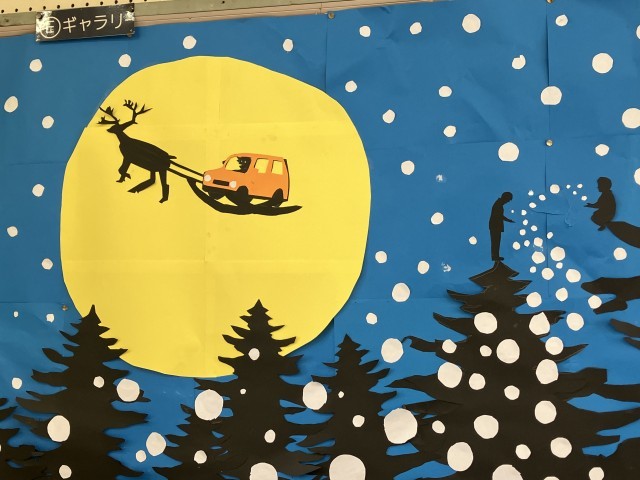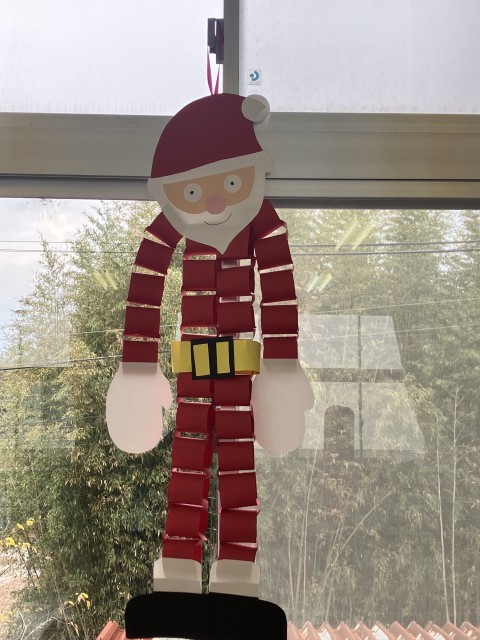 赤色画用紙で輪っかを作り、それをつなげてできたサンタさん🎄教室でみんなのことを優しい表情で見守ってくれています。