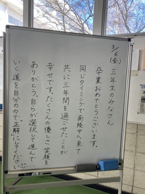 保護者のみなさま、これまで大変お世話になり、ありがとうございました。これからも南陵中学校は変わらずこの地にあります。学校を拠点とし、「集う誰もがいきいきと輝けること」を願い、教育活動を進めてまいります。引き続き、南陵中学校をよろしくお願いいたします。